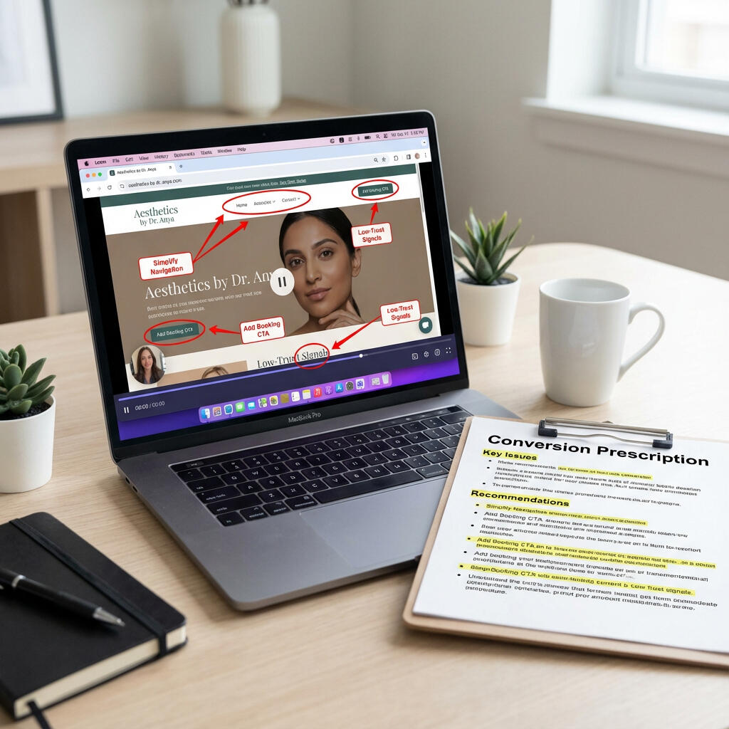 You’re not buying “tips,” you’re buying a diagnosis. Your audit includes a 20–30 minute Loom walkthrough where I click through your homepage, key treatment page, and booking steps and point out the specific copy, layout, and UX issues that are killing conversions.